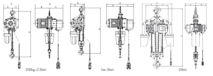Even the former alone has enough capacity to hold a static safe working load! - DC brake and motor with low power consumption A DC solenoid is used for the electro-magnetic brake. This lowers the electrical consumption throughout the operation of the electric chain hoist.